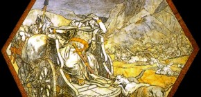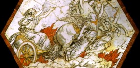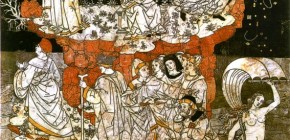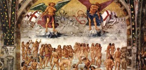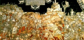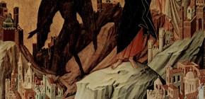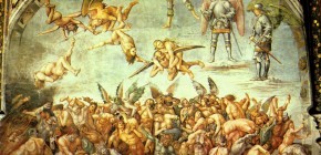 Sulla sinistra si vede la casa di Florenzo distrutta dal demonio, nel cielo i diavoli si a...