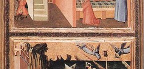 In alto la lotta tra l'angelo buono e lo spirito del male; il santo sfugge alle tentaz...