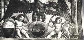 Sulla sfondo una rappresentazione di Norcia nella cui piazza si scorge un impiccato. Sulla...