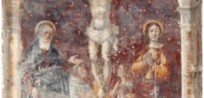L’affresco con la Crocifissione e Santi conservato nella prima cappella a destra della bas...