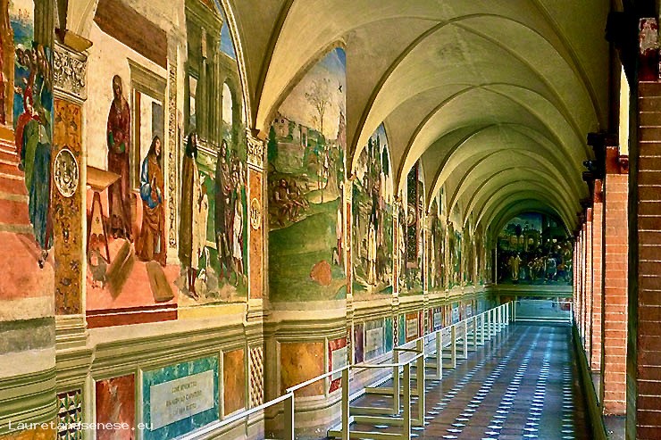 The cycle of frescoes covering the walls of the cloister were first initiated by Signorelli and Sodoma completed at a later date.