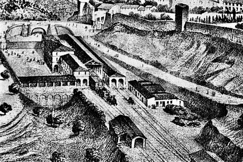 L'immagine chiarisce, inequivocabilmente, le condizioni del territorio fuori le mura cittadine al momento della costruzione della prima stazione ferroviaria senese.