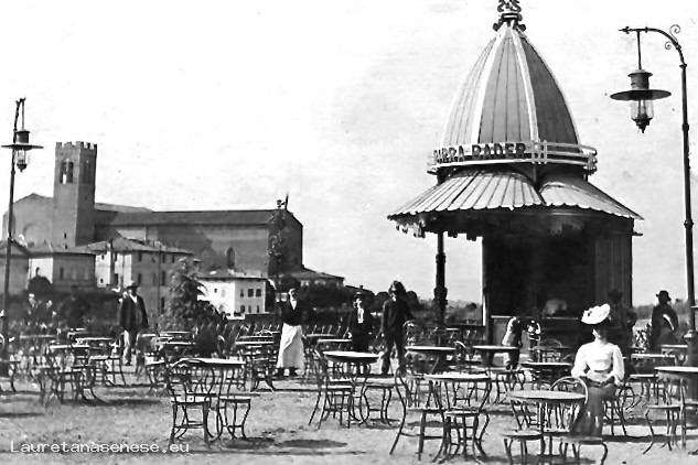In primo piano il chiosco delle bevande con sopra la scritta della birra che veniva servita ai tavoli.