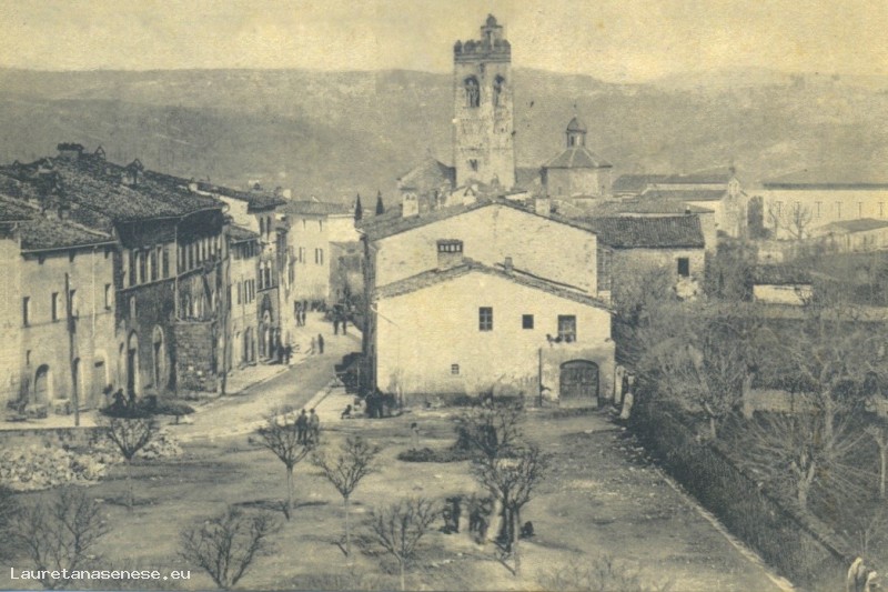 Sulla sinistra si nota il palazzo Spannocchi piuttosto mal ridotto e dotato di un pozzo, successivamente demolito.