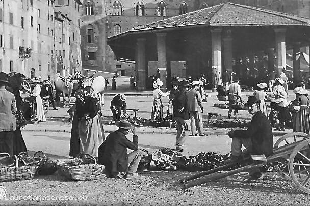 1920? - Gli ortolani offrono i loro prodotti in un angolo della piazza Siena