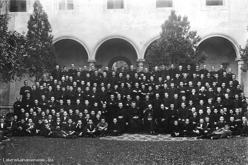 Bruno Torpigliani, ancora bambino, è ritratto sulla sinistra accanto ai sacerdoti. Lo si individua con facilità, perché il seminarista dietro di lui gli ha posato le mani sulla testa.