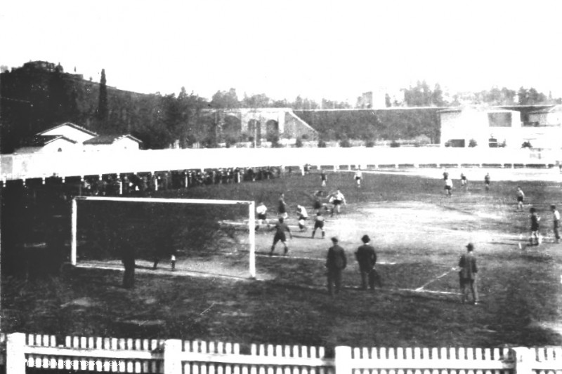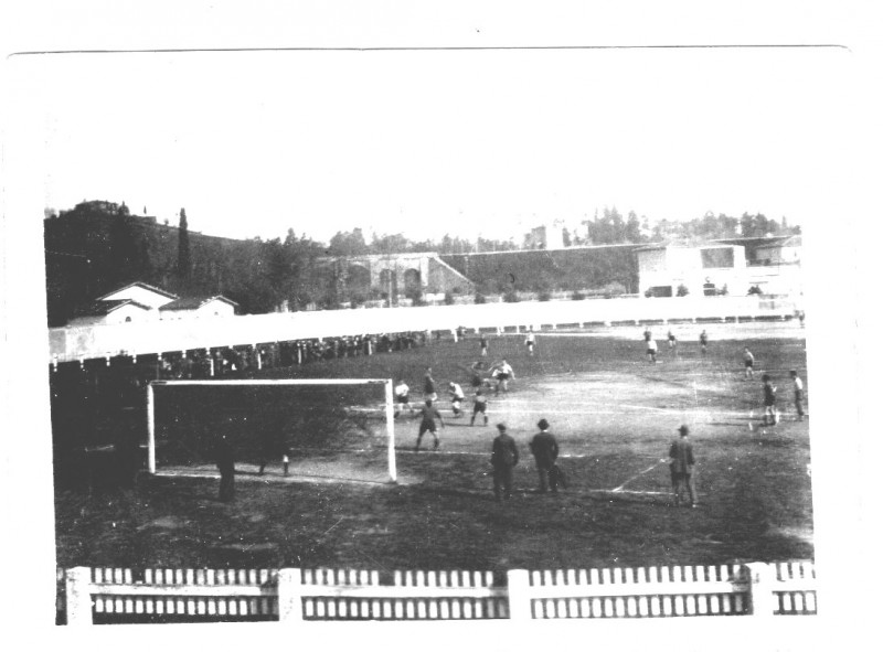Il Campo Sportivo G.Marconi durante una partita di calcio.Da notare le sole costruzioni esistenti: i vecchi macelli ed i Bagni pubblici. Infatti sullo sfondo si nota distintamente la scarpata della linea ferroviaria Asciano - Siena. Caratteristica, inoltre, la palizzata in legno che separava l'area verde di gioco dalla pista.