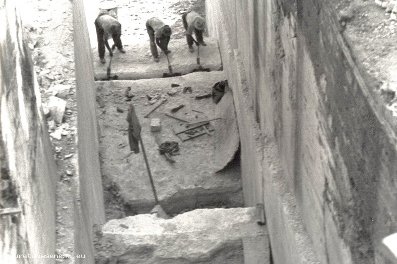 Si nota infatti che, oltre ai tagli laterali della trincea, risulta evidente il taglio trasversale ottenuto con i cunei bagnati e le mazze. Resta solo da far leva su di esso per provocare il ribaltamento del blocco di pietra.