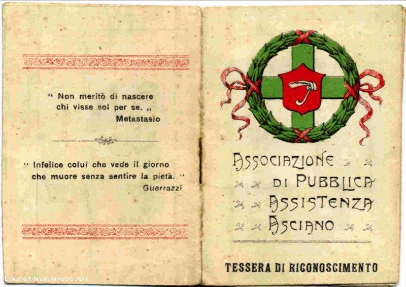 Documento che, oltre a testimoniare l'esistenza della Pubblica Assistenza ad Asciano, in tempi remoti, risulta interessante perché, contrariamente al solito, la Tessera è composta da numerose pagine in cui sono contenute precise indicazioni, il caso di primo soccorso.