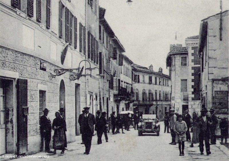 Oltre alle insegne comunali in lamiera e ai due lampioni ai lati dell’ingresso municipale, si notano a sinistra le porte in legno verniciate di bianco della macelleria di Giulio Mugnai.