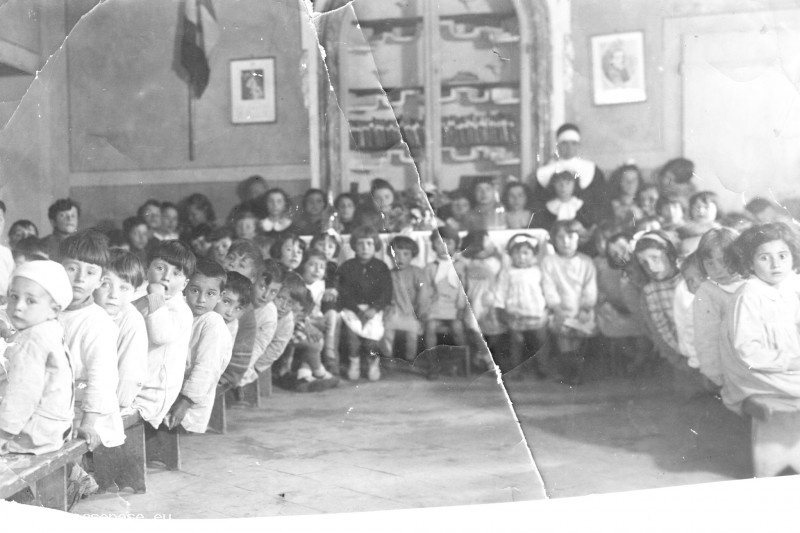 L'asilo delle suore ai tempi del fascio. Da notare la bandiera italiana sulla sinistra e le due immagini incorniciate, presumibilmente de Re e del Papa.