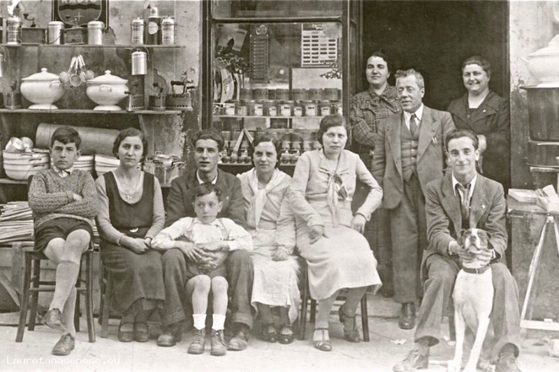 Le persone sistemate davanti al negozio per una bella foto ricordo di gruppo sono, da sisnistra in piedi: