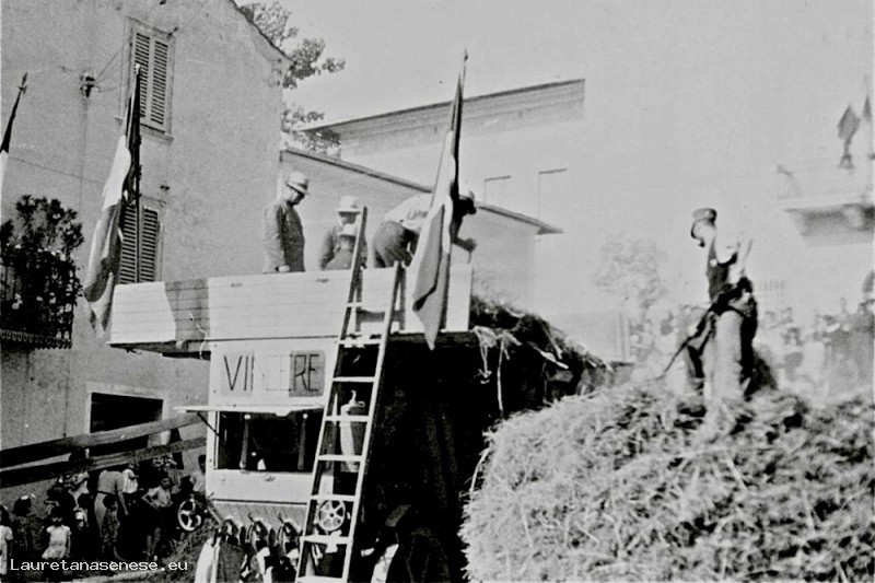 Particolare della Tribbiatura in Piazza Garibaldi, che evidenzia il motto scritto sul retro della macchina trebbiatrice, voluto dal regime fascista "VINCERE" con sotto il tricolore.