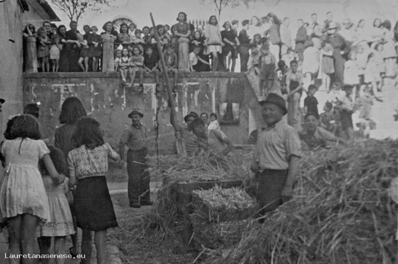 1940 - La tribbiatura del grano in Piazza Garibaldi, dettagli Asciano