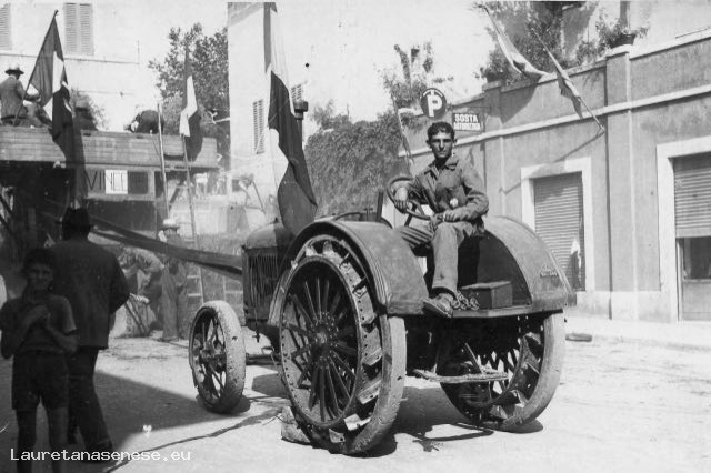Bella foto di Renato Barbi sul trattore utilizzato, in piazza Garibaldi, per effettuare la tribbiatura del grano. Questo trattore che, a guardarlo oggi, appare una specie di ferro vecchio, all’epoca nei primi anni ’40, era quanto di più moderno potesse esistere.