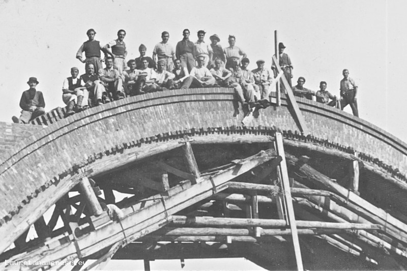 Squadra di muratori e carpentieri addetti alla ricostruzione del ponte ferroviario sul corso d'acqua "bozzone", attraversato dalla linea "Siena - Asciano"