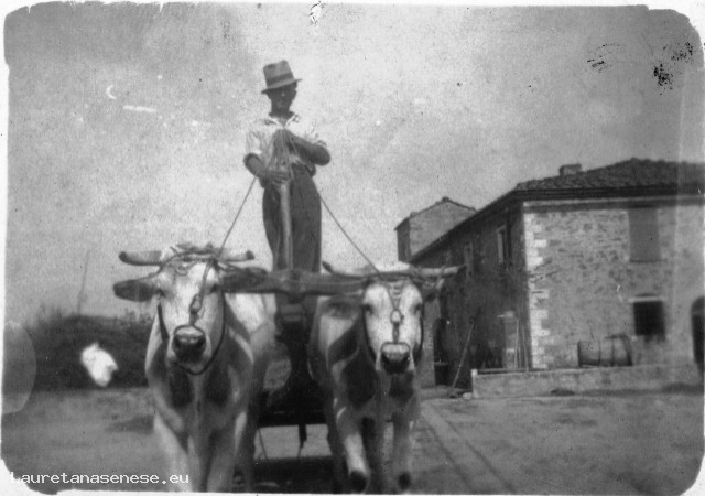 Foto che ritrae Osvan Soldati, alla guida di un carro di buoi di razza chianina.