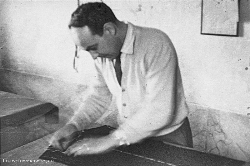 Foto che ritrae il sarto, Gino Pieri, intento a segnare con il gessetto la stoffa da tagliare per la realizzazione di un abito. Il Pieri, babbo di Fabio, è purtroppo morto nei primi anni '50 per una grave malattia allora difficile da curare.