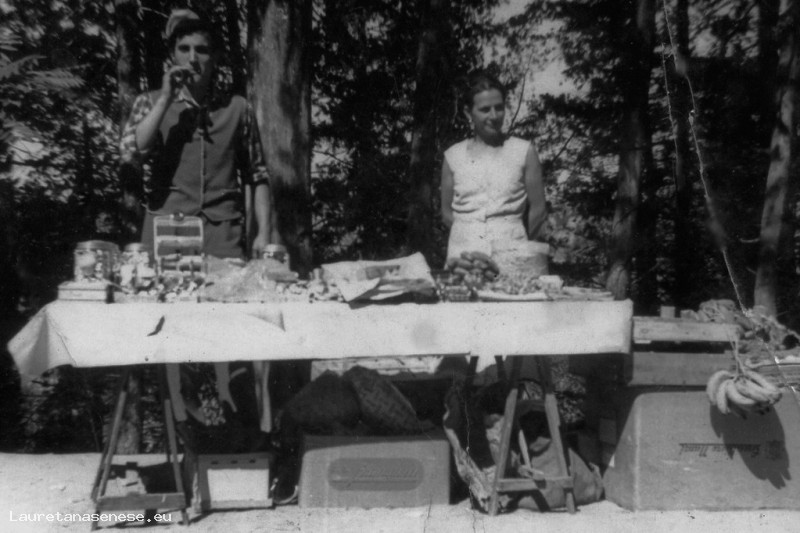 Foto che fa riflettere su come si viveva nell'immediato dopo guerra. In occasione di una festa allora molto frequentata, Vilma Bernini e il cugino Giovanni Anselmi, dietro un banco di vendita con "qualcosa" sopra da vendere.