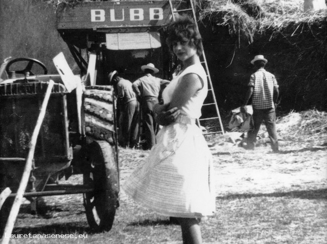 Particolare di una foto scattata a Scacciacucculi durante la tribbiatura del 1953. La ragazza in primo piano, essendo in età da marito, non ha perso occasione per mettersi in mostra. Infatti la tribbiatura, oltre all’impegno degli uomini di famiglia richiedeva il supporto di amici e conoscenti, provenienti dai poderi vicini.
