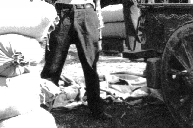 Questo particolare della tribbiatura a Scacciacucculi all'apparenza insignificante, testimonia l'uso quasi esclusivo, in campagna, dei carri trainati da buoi. In questo caso, il carro è stato disposto accanto alle balle di grano, in attesa di essere caricato. Anche se purtroppo si vede solo una piccola parte del carro, si possono notare alcuni particolari: