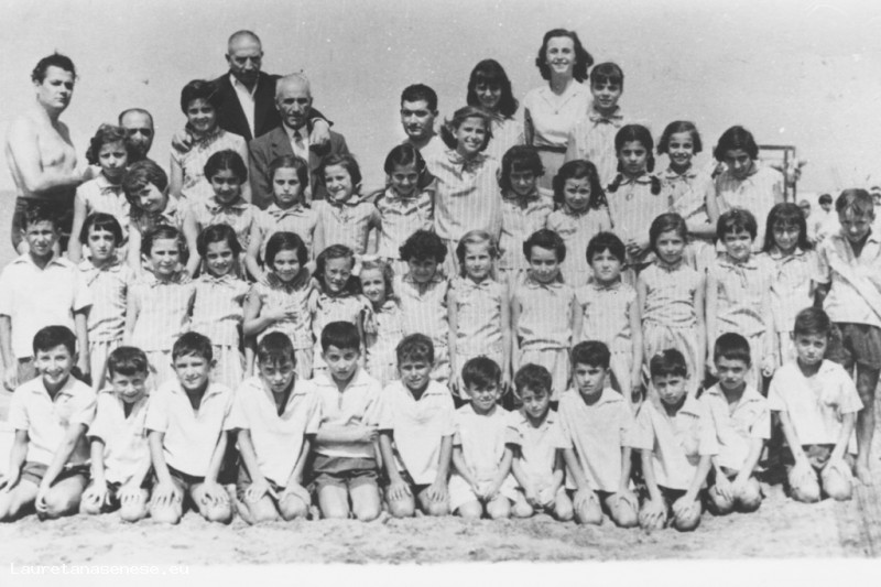 Che si tratti di una colonia comunale, lo testimonia la presenza del sindaco Pietro Provvedi a torso nudo sulla sinistra, accompagnato dal Segretario Comunale e dal Tecnico Comunale Alfredo Paci. Più avanti si riconoscono Aldo Zampi, accompagnatore dei visitatori adulti e la moglie del provvedi: Andreina Landi.