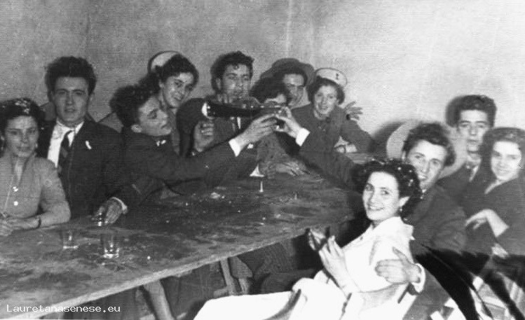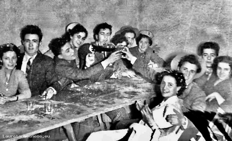 Gruppo di allegri giovani di allora a tavola per il carnevale, al Ravvivati.