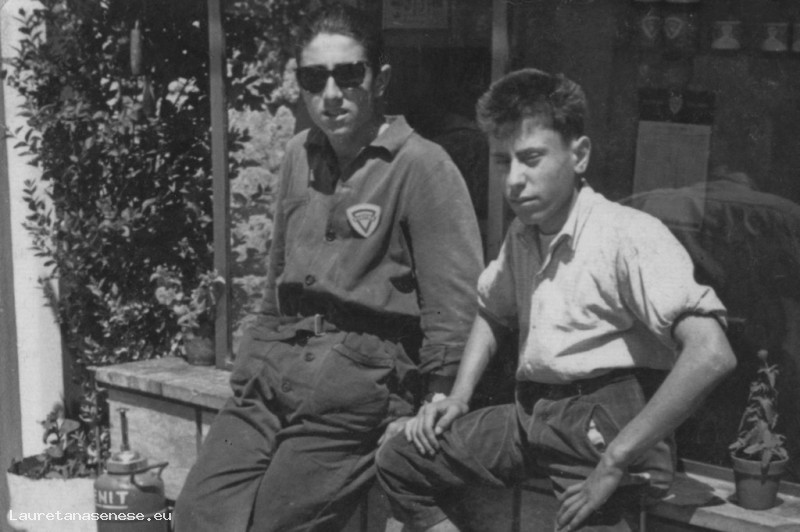 I giovani Guido Vaselli e Sandro Moscatelli addetti al distributore aperto da Aldo Zampi fuori Porta Massini di fronte a via Roma.