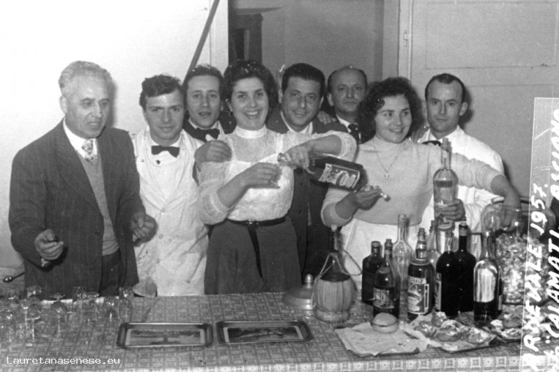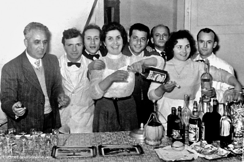 Il banco bar nel pianerottolo del Ravvivati al primo piano, davanti alla porta del bagno, a Carnevale. I personaggi molto noti allora: