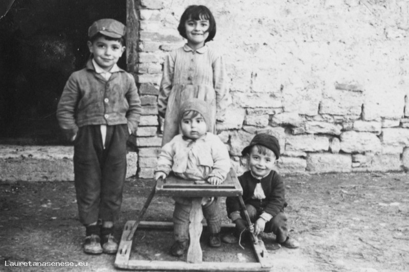 Una caratteristica particolare di questa foto, è il girello di legno che serviva per lasciar libero di muoversi un bambino non ancora in grado di muoversi in autonomia.