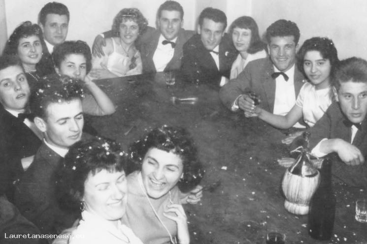Bella immagine che ritrae la bella gioventù di allora, seduta a un tavolo a bere, durante una festa di Carnevale. Ci sono da sinistra:
