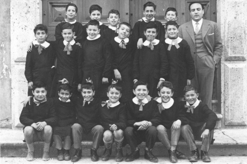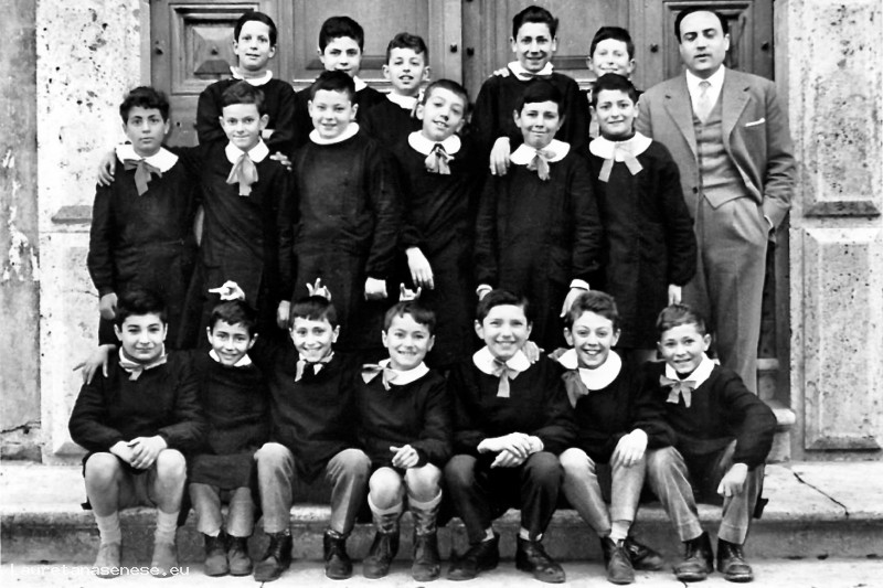 La classe del maestro Renato Lucatti, ancora collocata alle scuole vecchie e fotografata davanti al portone d'ingresso.