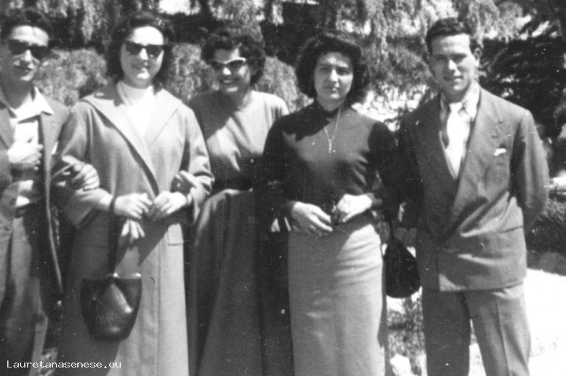 Gruppo di amici ritratti ai giardini Pubblici dei quali non siamo in parte sicuri dell'identità, da sinistra: