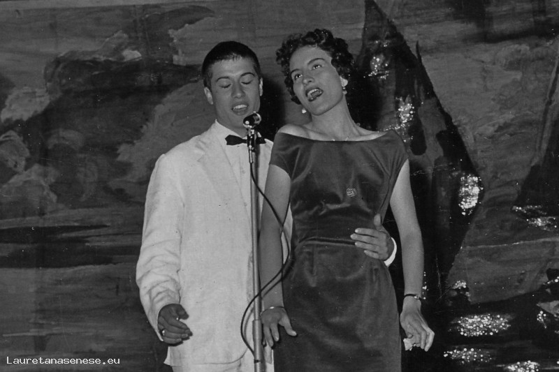 Due giovani locali si esibisconoo cantando in coppia, durante uno spettacolo canoro, presumibilmente svoltosi al Cinema Parrocchiale.