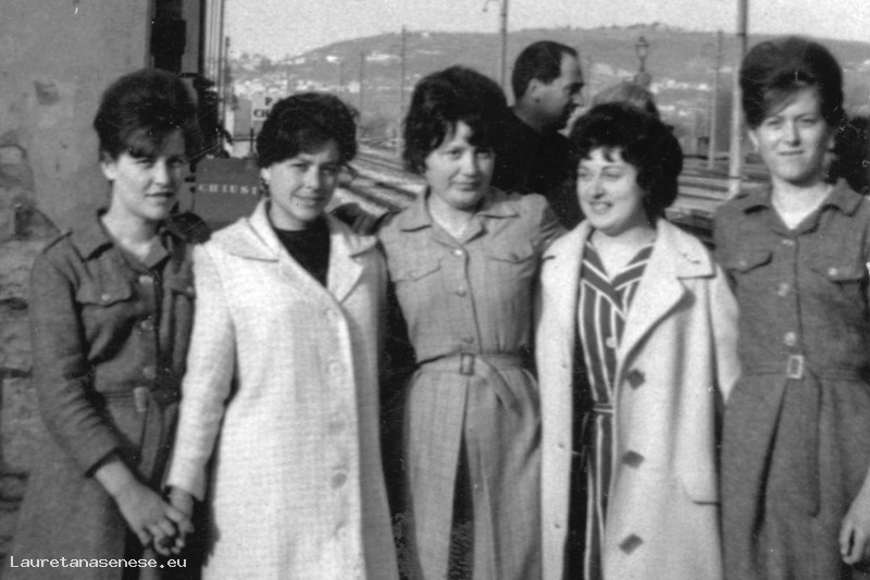 Gruppo di ragazze sul marciapiede della stazione ferroviaria di Asciano Scalo, in attesa che arrivi il treno.