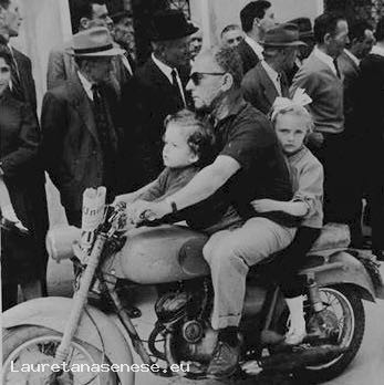 Palmiero in moto con due bambini, partecipa al corteo del 1° Maggio lungo il corso Matteotti.