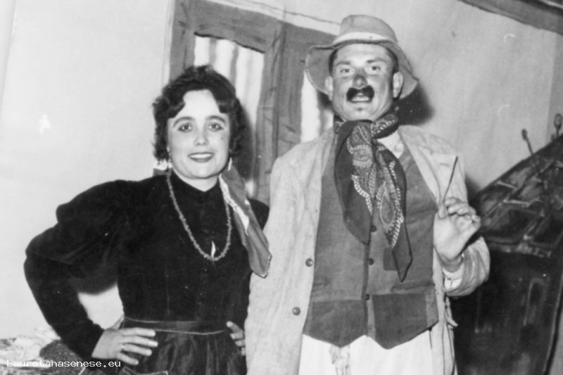 Una giovanissima Rema Carniani e un altrettanto giovane Elvio Angelini vestiti da campagnoli, mentre recitano insieme.