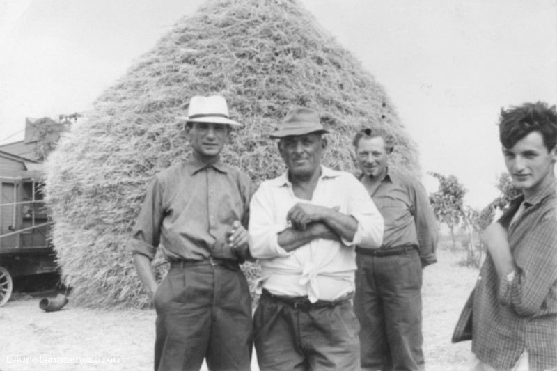 Le persone riconosciute che partecipano alla tribbiatura fatta ancora nell'aia con la tribbiatrice alimtata tramite cinghia collegata a un trattore: