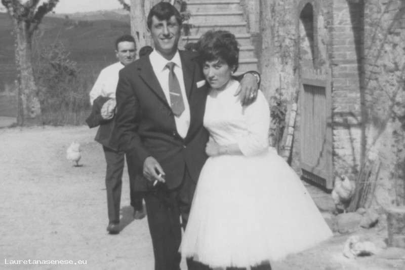 1964, 25 Aprile - Gli sposi nell'aia dopo il pranzo Asciano