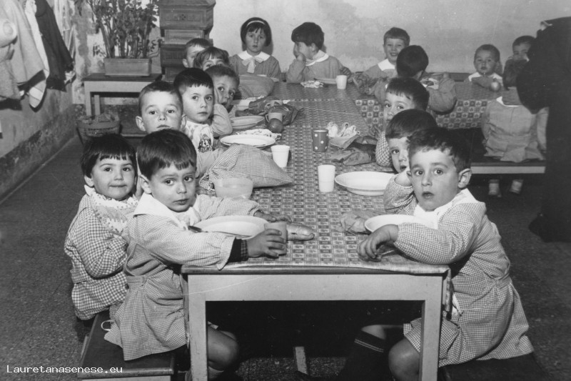 Foto insolita, che ritrae i bambini seduti a pranzo nei locali dell'Asilo Parrocchiale, gestito dalle suore. A quel tempo, non era ancora stata istituita la Scuola Materna Statale.