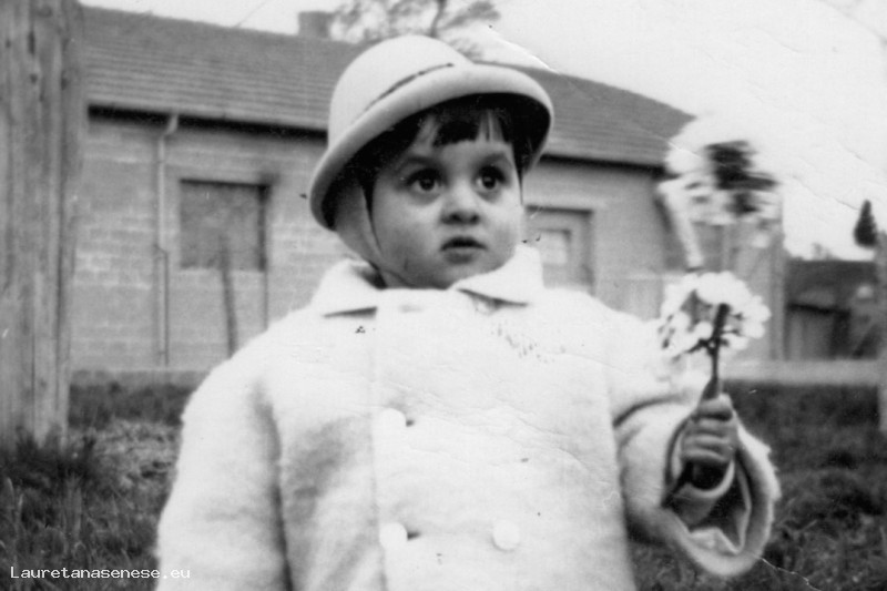 Sonia Cerretani, tutta incappottata, a fine inverno nell'aia del podere Le Piazze a Chiusure, dove vivevano i suoi nonni, con in mano fiorellini appena colti.