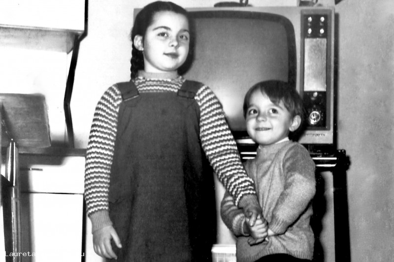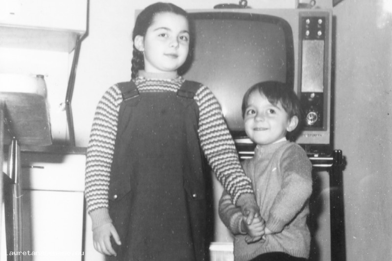 Una giovanissima Alessandra Fratagnoli tiene per mano il fratellino nella cucina di casa.