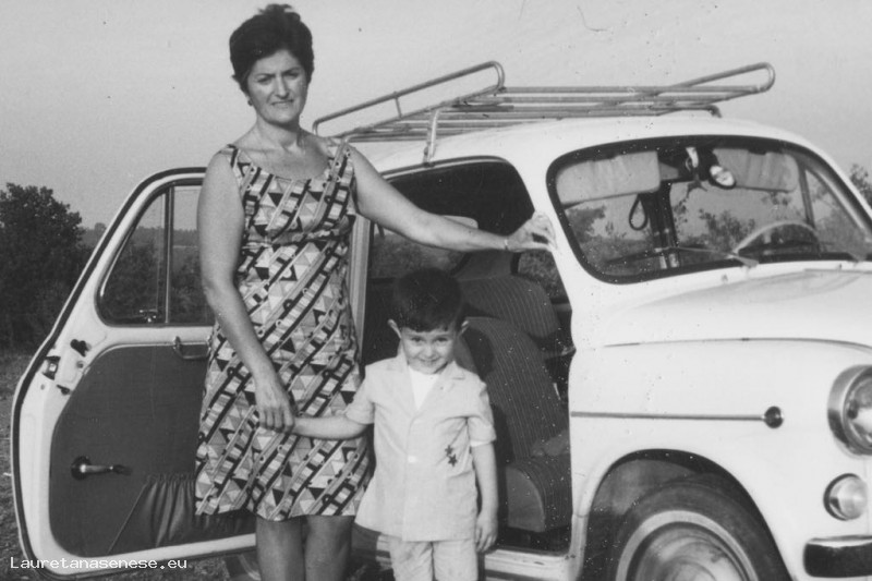 Umberto Mancini con la mamma Maria Luisa acanto alla mitica Fiat 600 con gli sportelli ancora apribili in avanti.