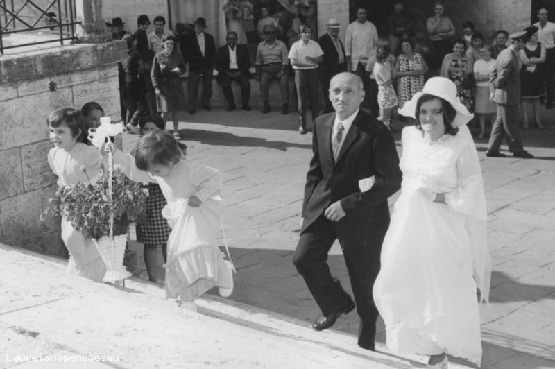 Attilio Ciacci, visibilmente emozionato, sale le scale della chiesa al braccio della bella figlia Graziella. Graziella Ciacci sta per sposare Enzo Giannettoni, figlio del Trillo.