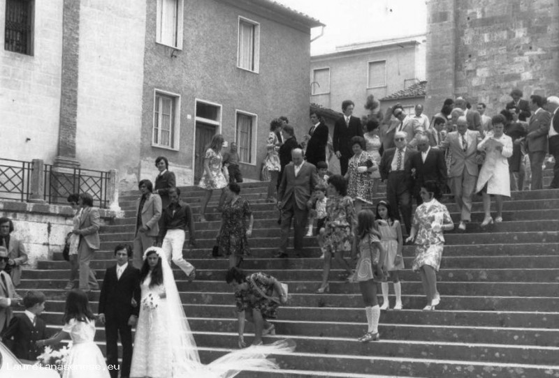In fondo alle scale della chiesa con gli invitati che seguono gli sposi, fra i quali si riconoscono: il Galassi ex vigile urbano e la moglie di suo figlio, sorella dello sposo.