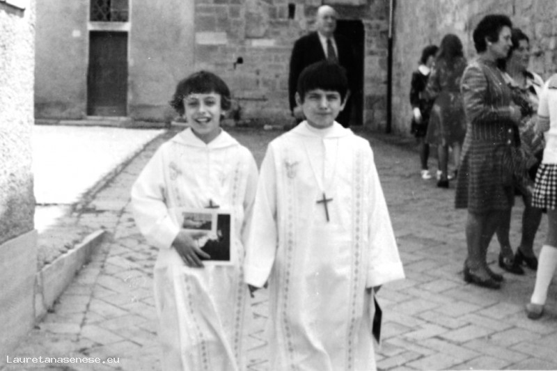 Roberto Cantelli, figlio di Enzo e Imola, esce dalla chiesa insieme al cugino, ultimo figlio di Alberto Cantelli, il meccanico.