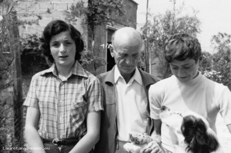 Palmiero Moscadelli, meglio conosciuto come il fattore della Pievina, in mezzo ai gemelli adolescenti: Nella e Sandro, con il cane di famiglia che vuol far parte del gruppo.