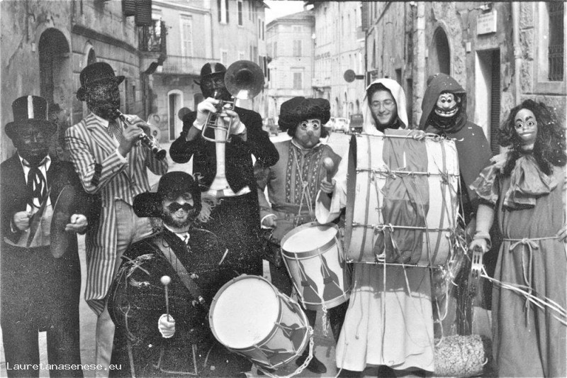 Foto scattata una domenica mattina di carnevale che ritrae alcuni buontemponi, componenti della locale Filarmonica, organizzatisi per costituire una piccola orchestrina temporanea.