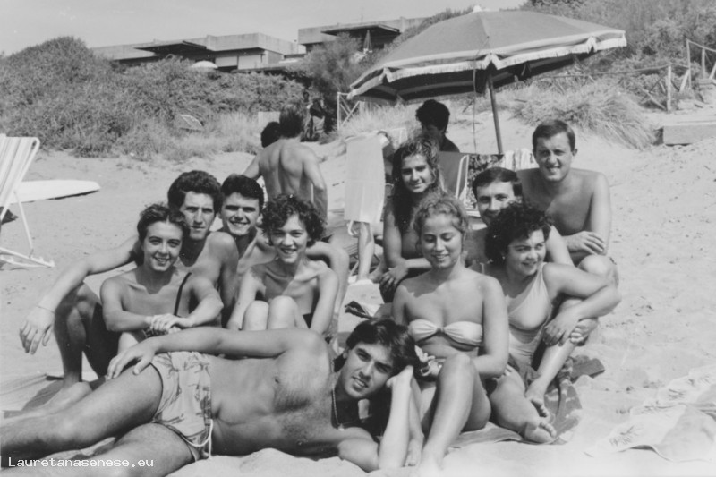 Gruppo di amici insieme al mare, presumibilmente a Castiglione della Pescaia, sulla spiaggia a sud del porto canale: