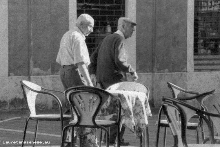 Due vecchi amici avanti con gli anni, in piazza Garibaldi:
